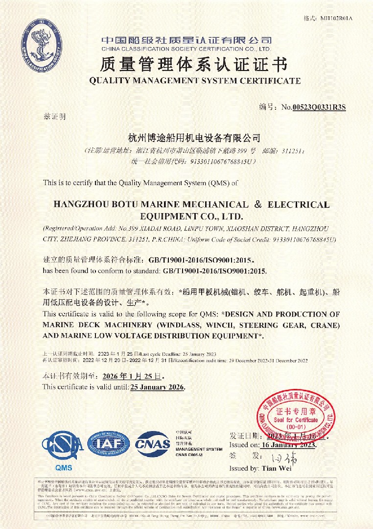 公司具有較強的技術(shù)研發(fā)實力,在船用產(chǎn)品行業(yè)擁有十余項實用新型專利,三項發(fā)明專利。公司以質(zhì)量求生存,創(chuàng)新求發(fā)展的企業(yè)宗旨為主導(dǎo)。全面貫徹中國船級社ISO9001:2015質(zhì)量管理體系認證。各類產(chǎn)品通過并取得了CCS、BV、DNV 、LR、ABS、RINA等各大船級社的認證和證書。產(chǎn)品廣泛使用在海事,漁政、公安、邊檢、消防、港口、碼頭等各種公務(wù)、工程船舶以及各種高速船、豪華游艇等高性能船艇。成為國內(nèi)高性能船舶甲板機械的首選品牌,部分產(chǎn)品已遠銷國外。